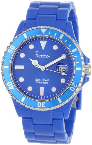 Fun and functional Unisex Sea Diver plasteramic collection from Freelook. Using the name "plasteramic" because of a special coating used to treat the watch. Blue band with matching blue dial and bezel. Calendar date located at the 3 o'clock hour. This timepiece features reliable Japanese quartz movement, and a durable mineral crystal protects the analog dial. This watch is water resistant to a depth of 330 feet (100 meters).